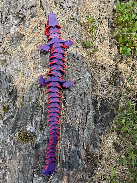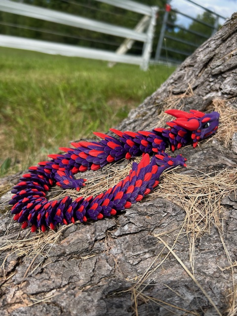 Dragons are probably the most popular of 3D-printed creations, and this “Zephyros” dragon is an example of why they are so popular. He is fully articulated, with each of his 30 sections able to move. In addition, the dragon’s four legs also move. Each scale has a feather-like appearance, with some purple and others red. Add in his red horns and his black eyes with white pupils, and this Zephyros is sure to delight fans of dragons as well as those curious about 3D-printing. This cool dragon measures 14.5″ from the tip of his nose to the tip of his tail. My 3D-printed animals are all individually printed, with no mass production. No two prints are alike, and each will have minor variations – a truly unique gift or keepsake.