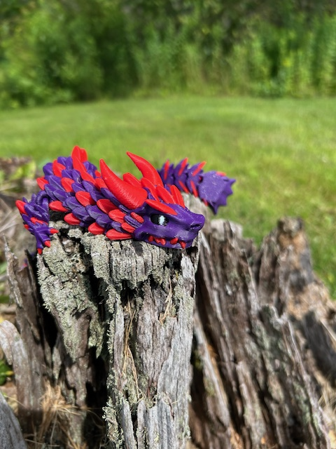 3D-printed articulated dragon. This version is printed with purple as the base color and red to accent his scales, horns, and teeth.