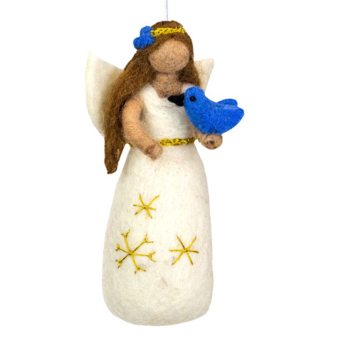 Embrace diversity and peace with our Felt Multicultural Angel Ornament Collection. These enchanting angels, adorned with golden snowflakes on their dresses, hold birds symbolizing the Blue Bird of Hope, The Dove of Peace, and remeberance cardinal to remember those who we have lost. Choose from the brunette with a blue bird, the dark-skinned angel with a dove and olive branch, or the pale-skinned blonde with a cardinal. Crafted from solid wool, they’re perfect for shelf decor or hanging as ornaments, adding magic to your holiday. They each have wire-wrapped arms that can bend and move, they create a lifelike effect, making them great as toys for kids too.Spread love and unity with these ethereal angels, a meaningful addition to your celebrations.