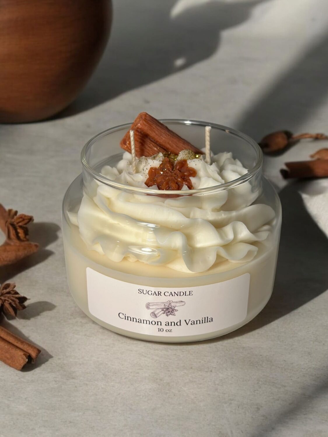 Celebrate life’s coziest moments with the Cinnamon Vanilla Whipped Candle by Sugar Candle. This 10 oz hand-poured delight features a beautiful two-layer design: a smooth white soy wax base topped with whipped wax swirls, a real cinnamon stick, a delicate cinnamon flower, and a touch of gold glitter — all elegantly styled in a clear minimalist glass jar.