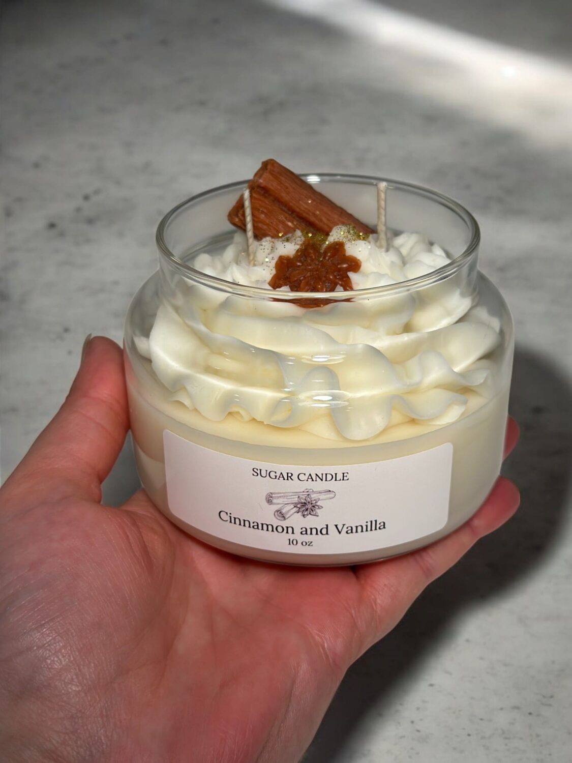 A cozy, handcrafted 10 oz soy candle with warm cinnamon and vanilla notes. Features a whipped top, real cinnamon stick, floral decor, and golden shimmer — perfect for gifting or home ambiance.