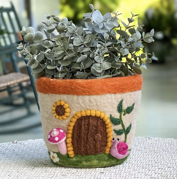 Introducing our adorable Fair Trade Fairy House Felted Planters or Storage Baskets. Featuring various charming woodland homes with nature themed backdrops.These small storage baskets are perfect for organizing your little one’s toys, pacifiers or other small supplies. Alternatively, they can be used as planter liners, adding a touch of nature-inspired beauty to your indoor garden.