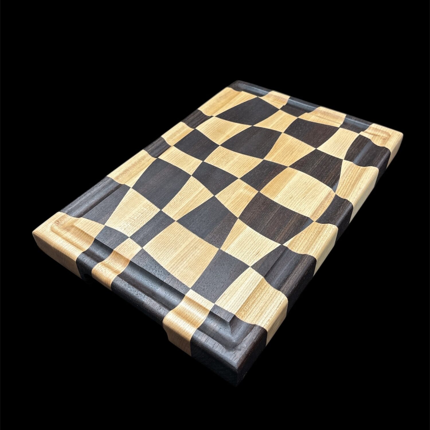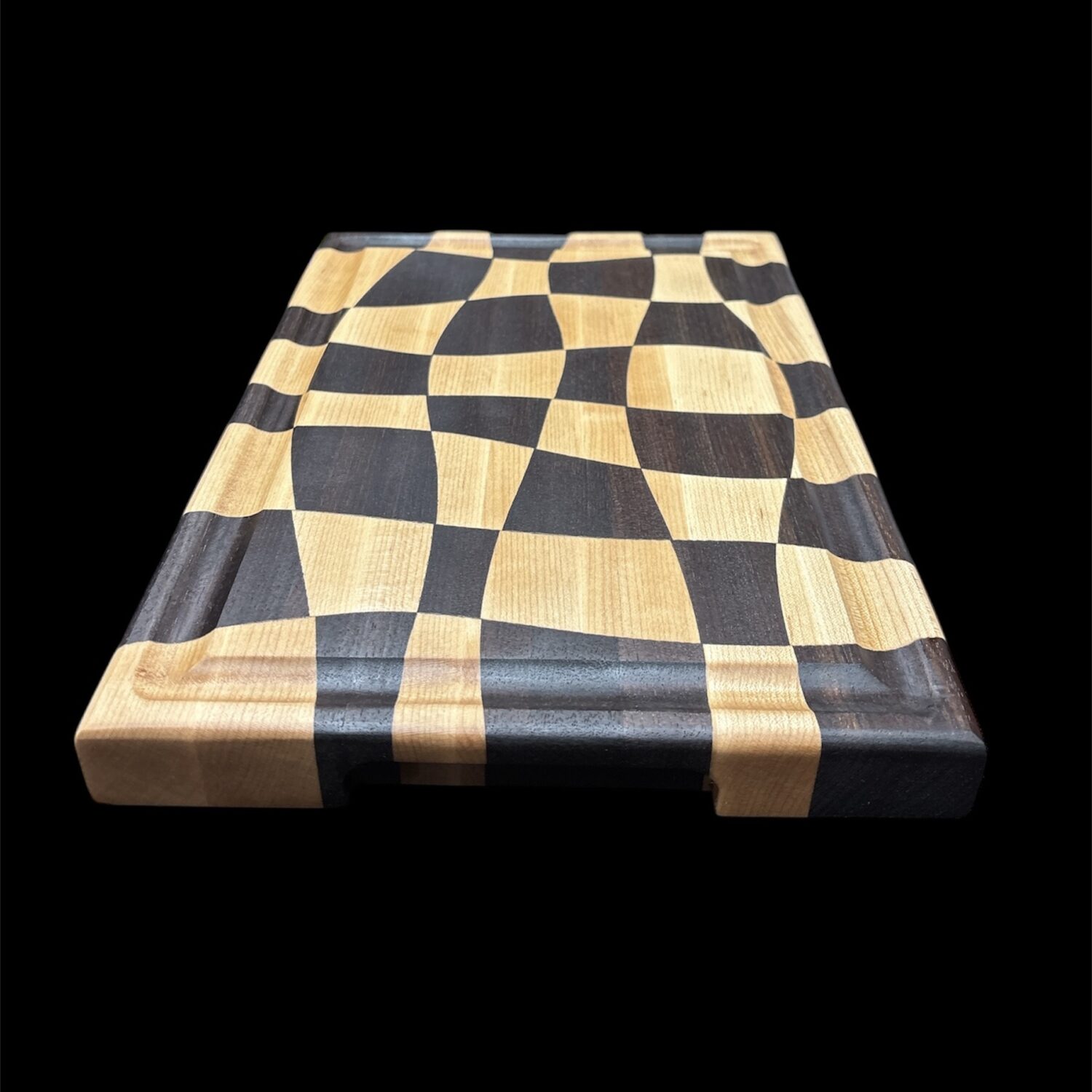 Elevate your kitchen with a functional work of art! This Handmade Drunken Pattern Wooden Cutting Board is crafted from a blend of Maple and Walnut. Including a juice groove, finger handles and rubber feet, it’s perfect for both chefs and home cooks.