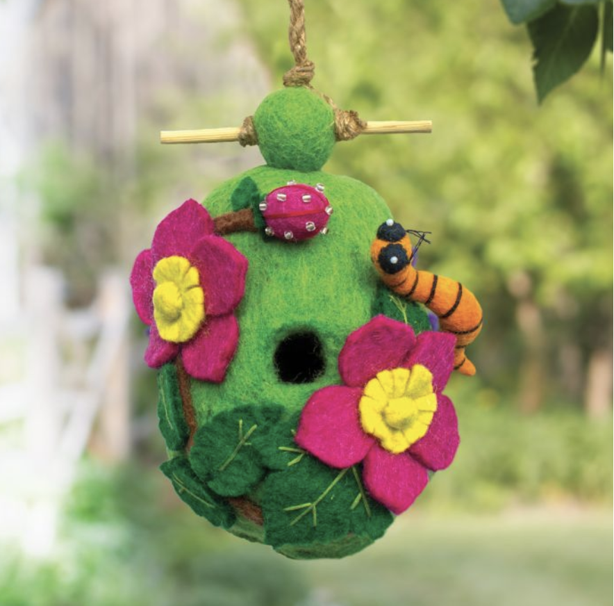 Fair trade felted birdhouse garden collection offering designs adorned with flowers, bugs, butterflies, and birds. A gift any nature lover is sure to enjoy!