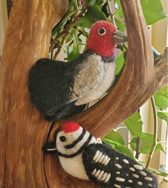 100% Wool hand felted collectible bird ornaments. Each are designed by designer Rebecca Piermarini and then made at a fair trade center in Nepal