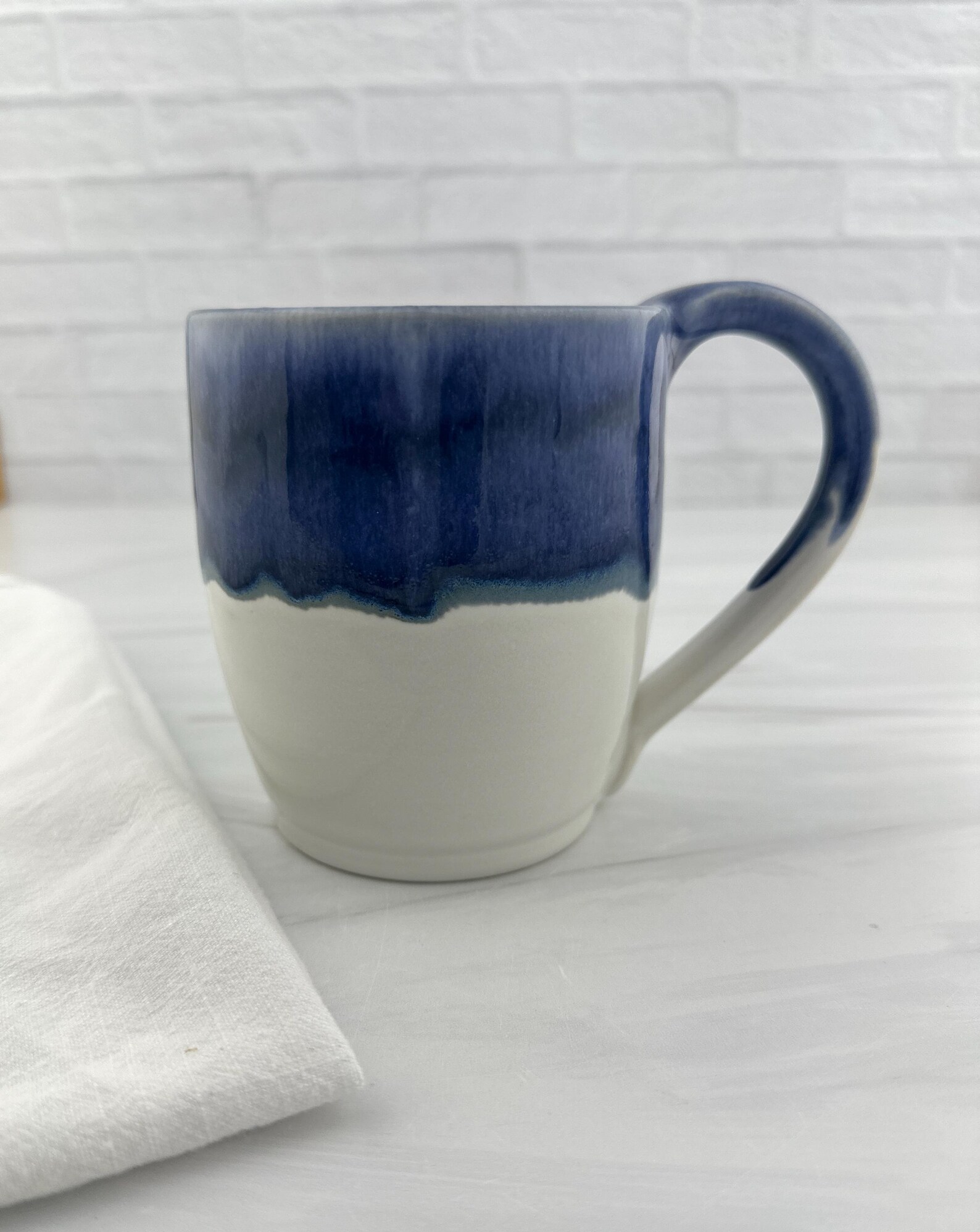 A handcrafted blue and white ceramic mug made in Longmeadow, MA perfect for coffee, tea, or your favorite comfort beverage.
