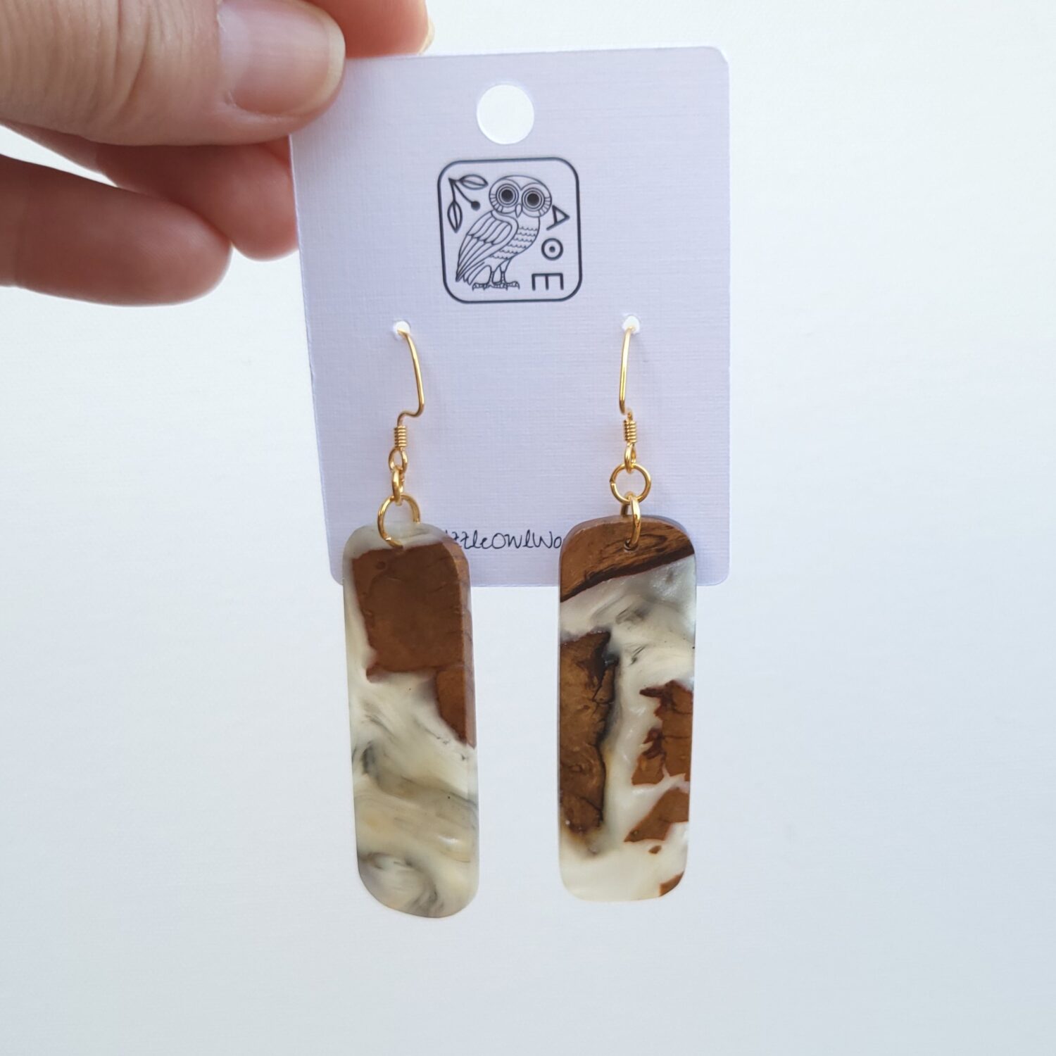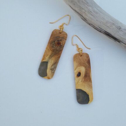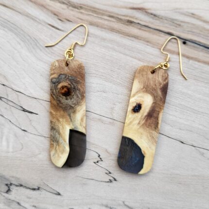 These earrings are a stunning fusion of nature and artistry, crafted from two pieces of olive wood seamlessly joined by flowing pearl resin. The burl, known for its intricate grain patterns and rich character, features swirling knots, voids, and organic textures that create a sense of depth and movement. The pearl resin fills the spaces between the burls, adding a contrast to the warm, earthy tones of the wood.
