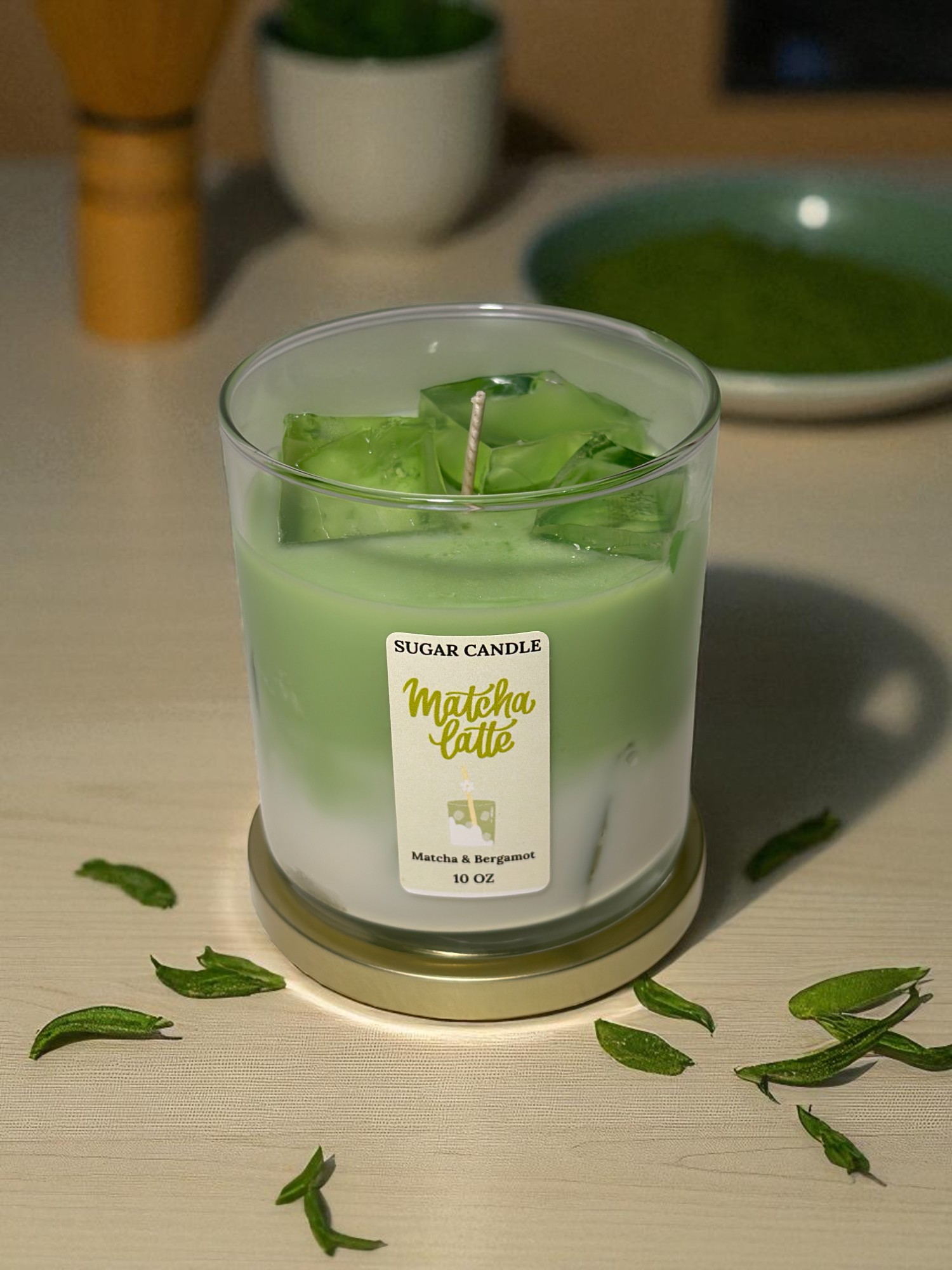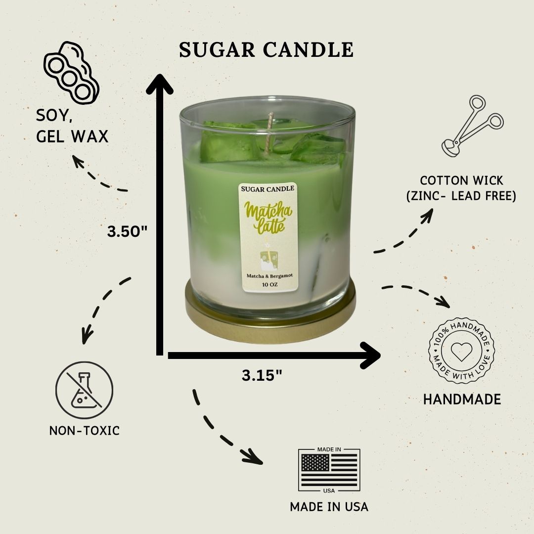 Handcrafted Matcha Candle made with soy and gel wax. Features a refreshing matcha and bergamot scent, realistic gel wax ice cubes, and a caffee-style layered design. 10 oz glass, ~55+ hrs burn time.