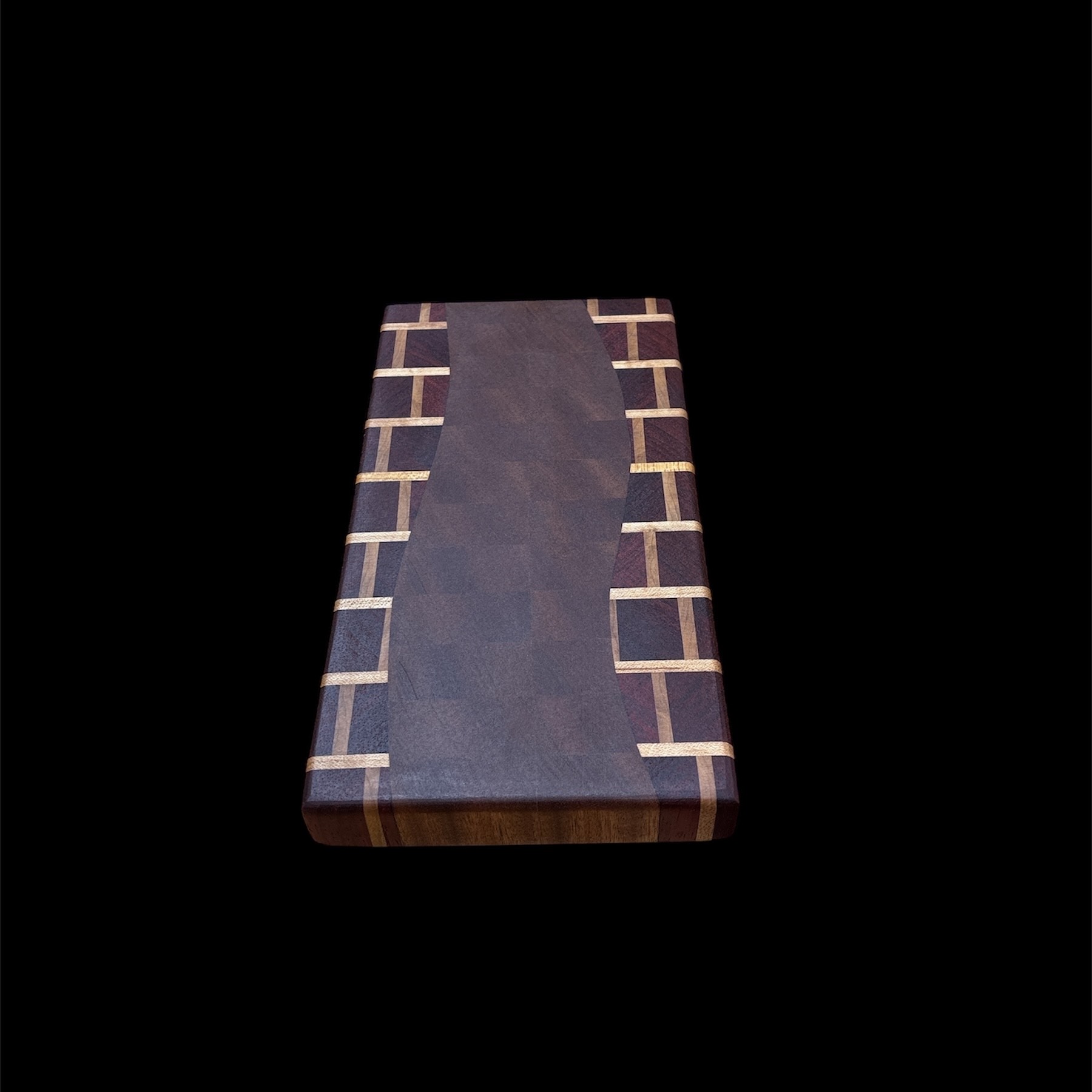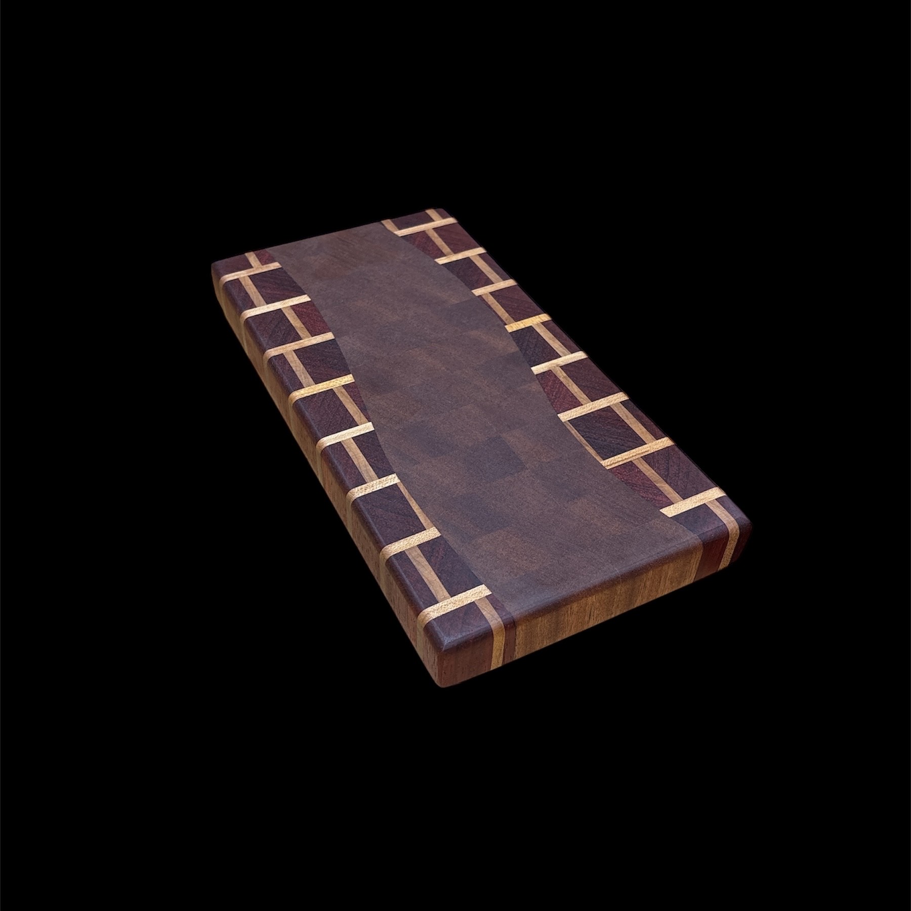 Elevate your kitchen with a functional work of art! This Handmade Sepele River Wooden Cutting Board is crafted from a blend of Maple, Padauk and Sapele. Featuring rubber feet, it’s perfect for both chefs and home cooks.