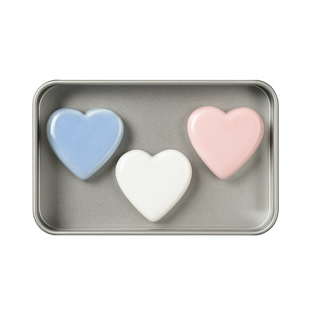 This set of three ceramic heart magnets comes in a rectangular metal tin. Each heart is glazed in a different color- pink, blue, and white- in honor of the transgender flag and trans pride. But they are also just lovely pastel hearts for anyone! The strong brushed nickel magnets are glued onto the back of each magnet with industrial strength glue.